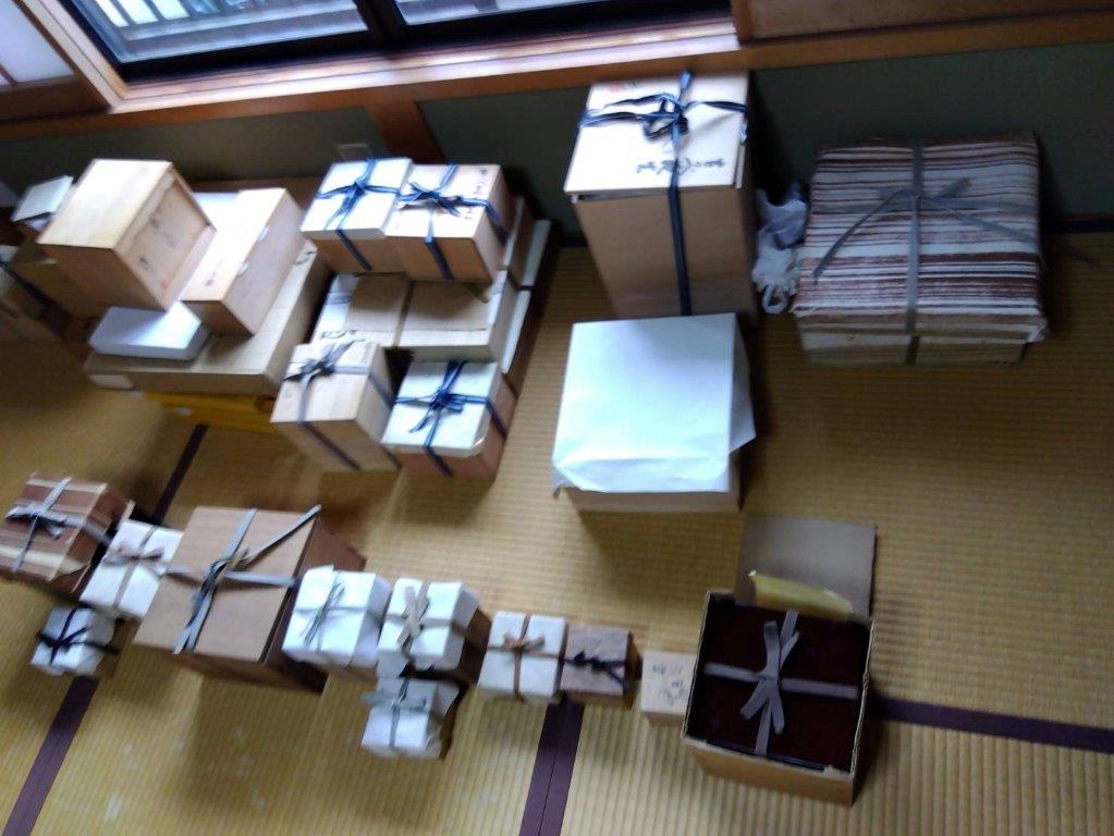 写真のまとまった数のお茶道具をはじめ、絵画、昭和時代の贈答品など大量にお譲り頂きました。聞けば50年ほど住んでらしたそうで、天袋からは40年ほど前の贈答品などが出てきました。