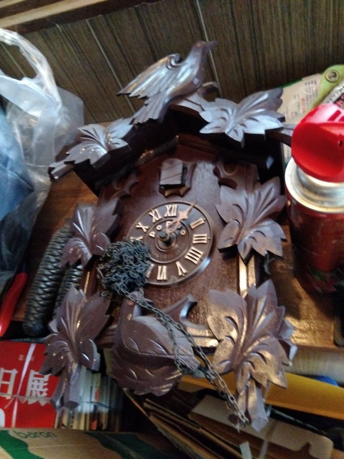 お預かりしたのは、昭和の香りを色濃く残す、木彫りのカッコー時計。