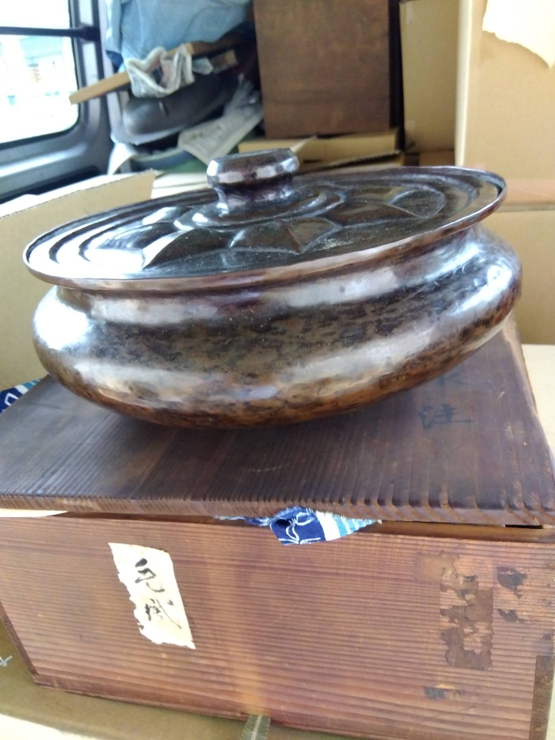 | 買取品目 | ・唐銅製 蓋付き器(香炉または水指と推定) ・推定サイズ:直径約26cm/高さ約15cm(蓋含む) ・蓋に花弁文様、共箱・布付き |