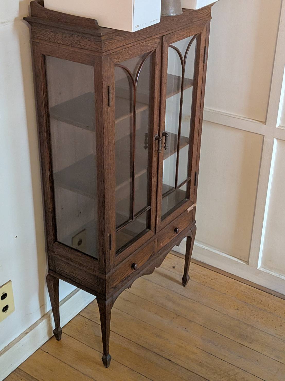 現場で目にしたのは、木目の美しい無垢材を使った古いガラス陳列棚。四方にガラスを配し、棚内部を明るく見せる構造で、猫脚の脚部や扉のアーチ型意匠が当時の職人技を感じさせます。