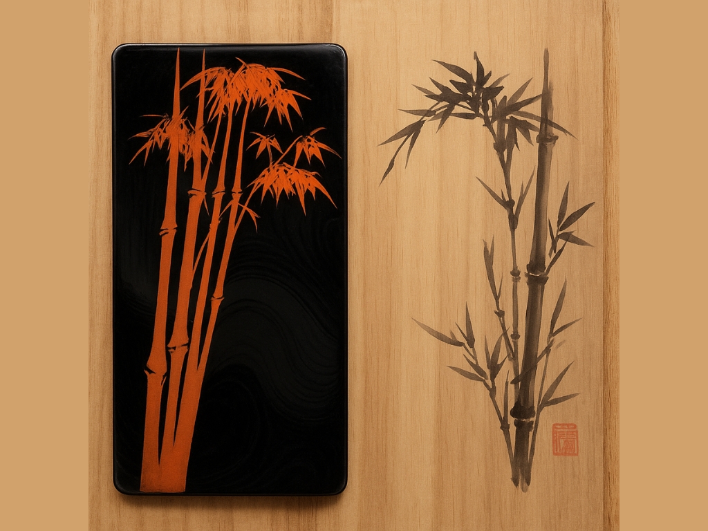 今回拝見した漆器は、黒漆の上に朱色で竹が描かれた美しい作品で、漆芸ならではの深みと光沢が際立っていました。