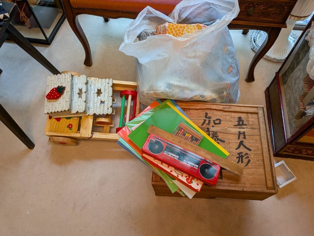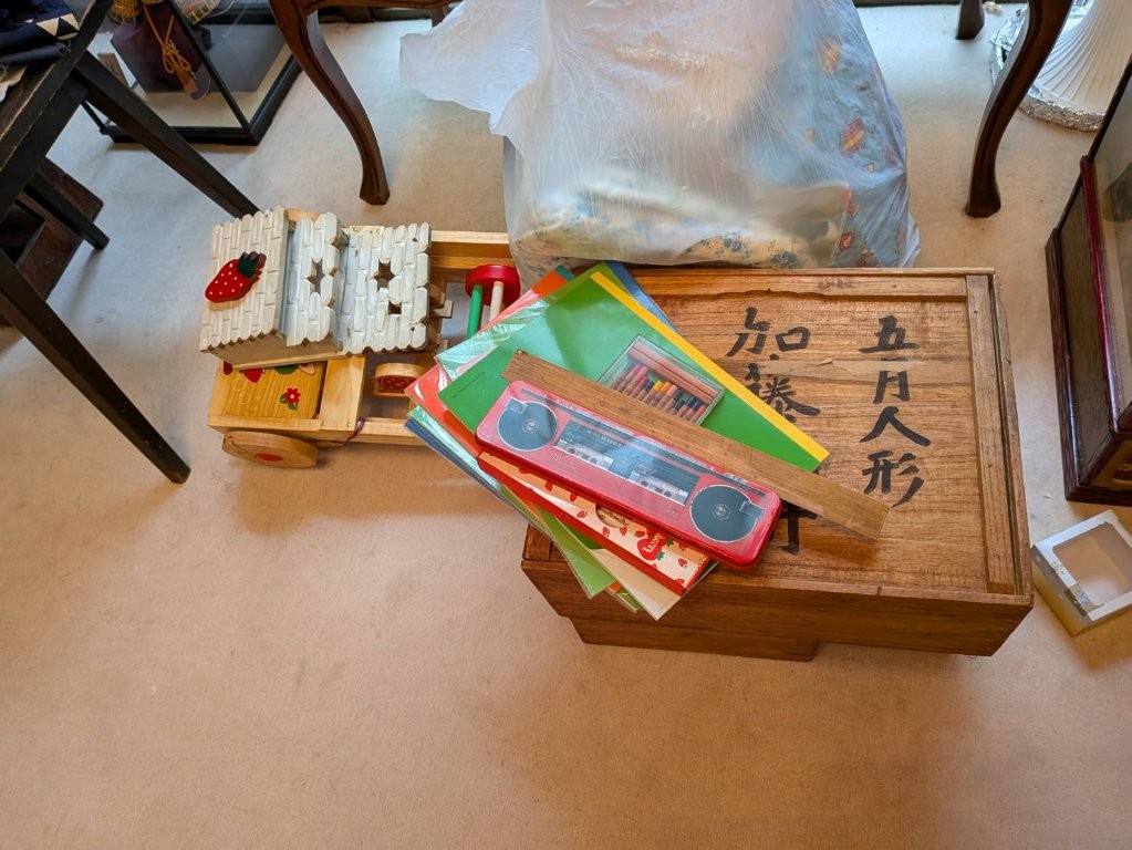 現場には、ラジカセ型筆箱・木製の手押し車・色鉛筆やクレヨン・70年代の下敷きやノート類などが整然と保管されていました。