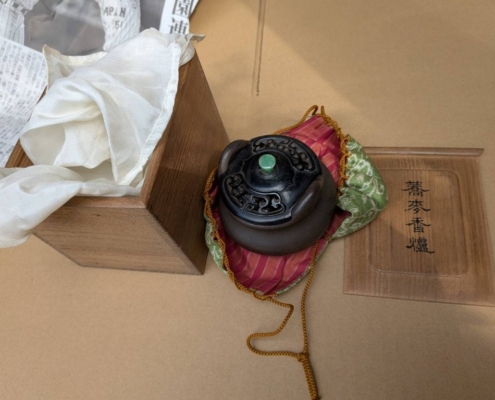 木箱や仕覆に収められた骨董品の中に、中国の伝統工芸を色濃く残す「香炉」があり、重厚な存在感を放っていました。