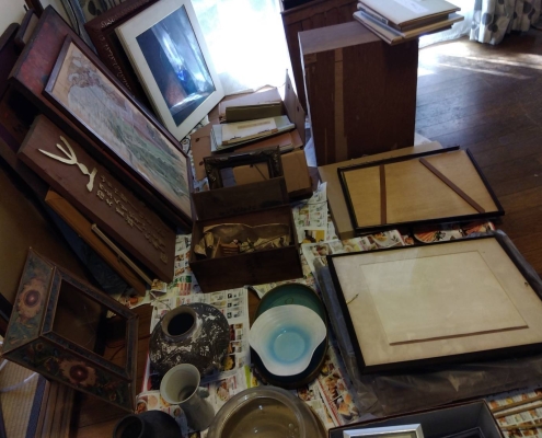 実は先々月に一度お伺いし、焼き物や飾り皿などを中心に買い取りさせて頂いていたのですが、引き続き遺品整理が進む中で収納部屋の奥から版画や掛け軸など古臭い品々が出て来たとの事でお電話頂きました。
